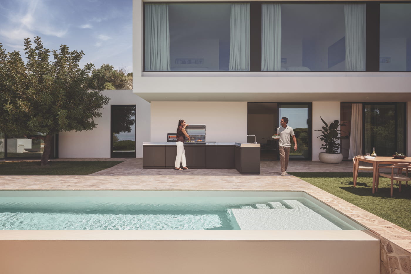Das Ergebnis ist ein Arbeitsumfeld, das sich nicht wie eine klassische Outdoorküche anfühlt, sondern wie eine vollwertige Küche im Freien.