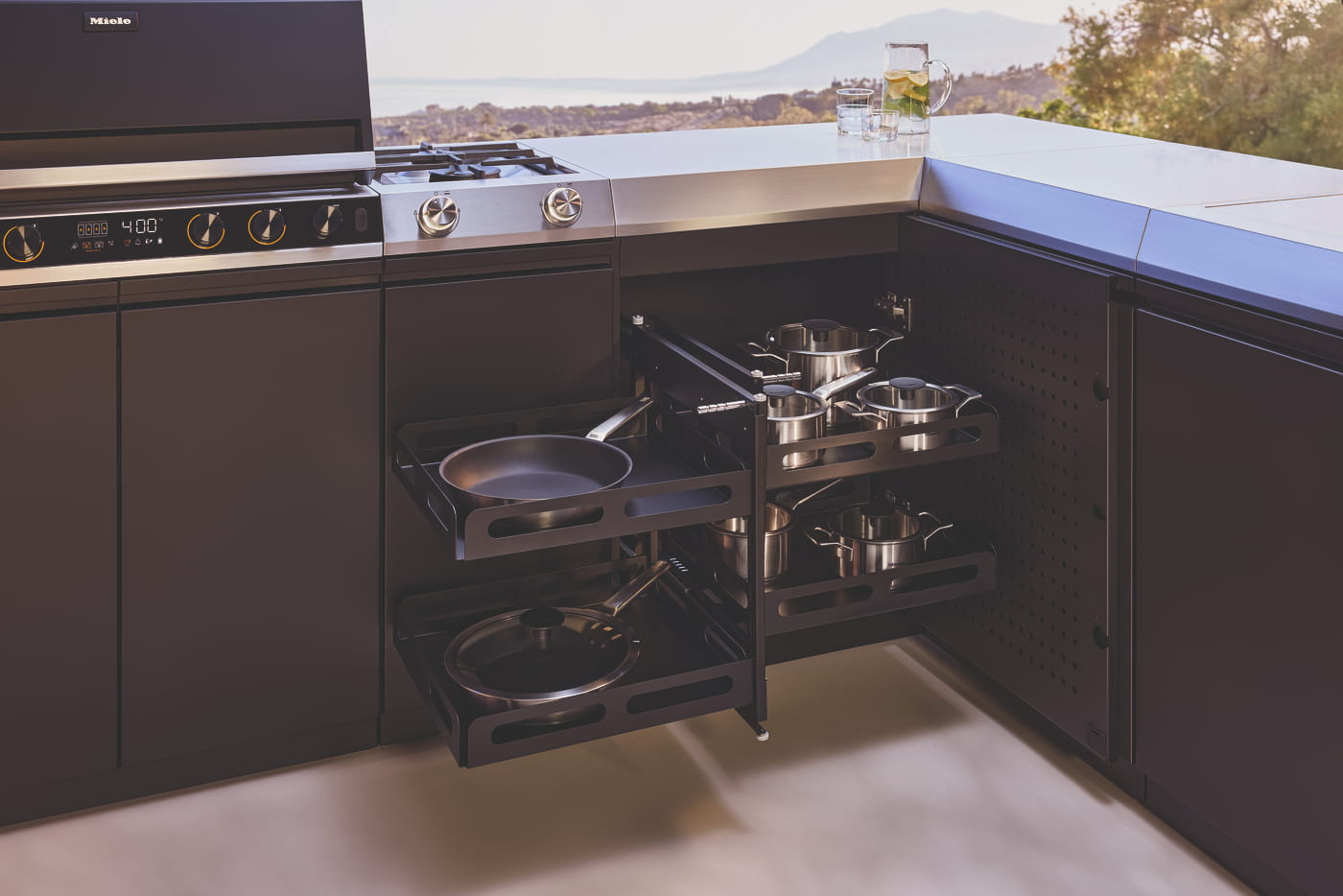 Die „Dreams“ Küche basiert auf einem abgestimmten System aus Miele Geräten und Modulen, die gemeinsam den gesamten Kochprozess im Außenbereich abbilden.